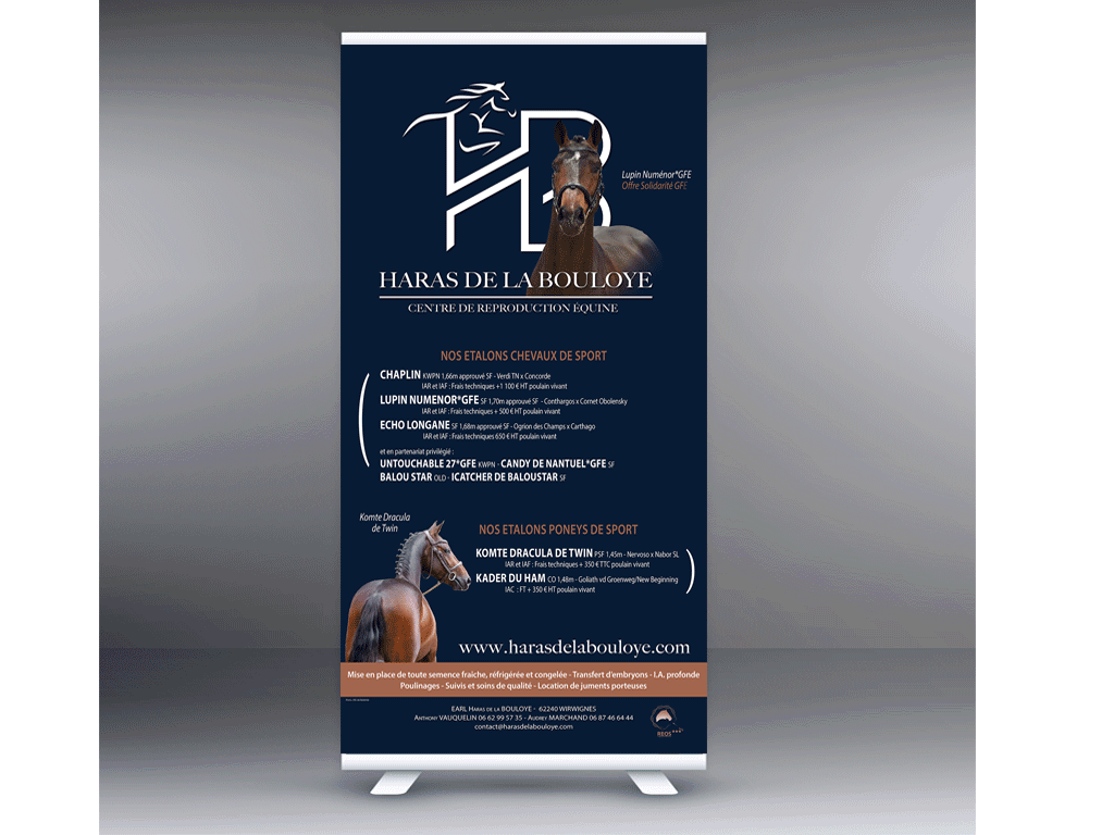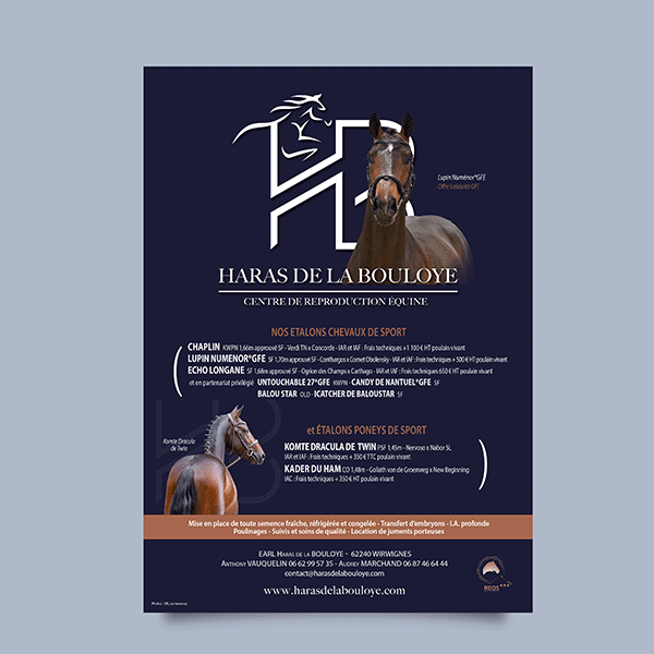 Depuis maintenant de nombreuses années, le Haras de la Bouloye nous confie la réalisation de ses pages de publicité, pour la promotion des étalons qu'il distribue.