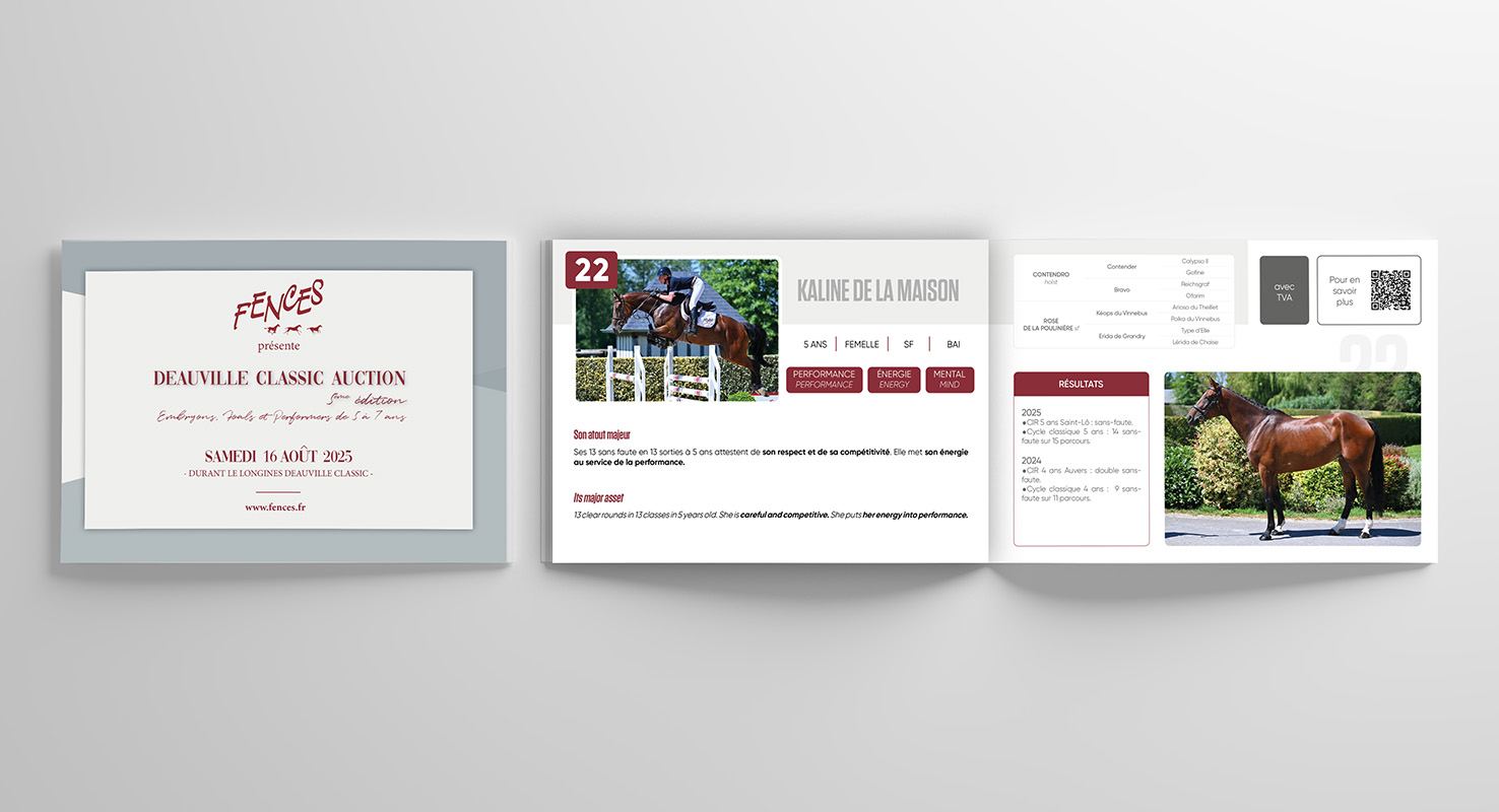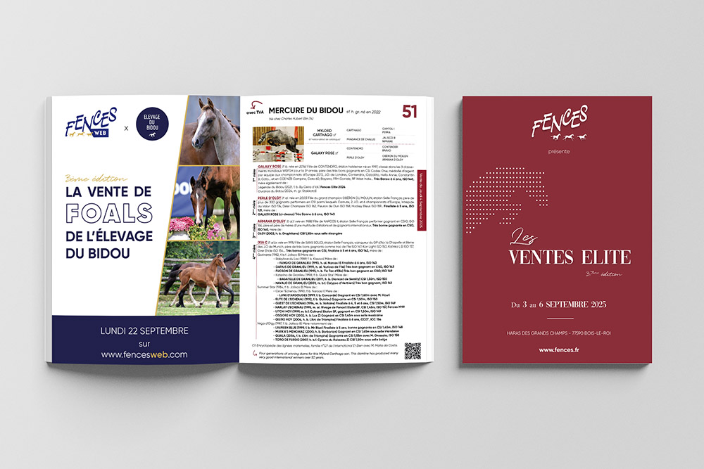 Spécialiste de la recherche généalogique équine, Horse Graphic réalise depuis de nombreuses années les catalogues pour les ventes aux enchères des chevaux de sport proposées par l'Agence Fences.